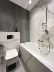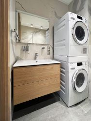 Планировка продумана для комфортной городской жизни: просторная кухнягостиная со столовой зоной, две уединённые спальни: мастер-спальня с гардеробной и санузлом, вторая спальня и санузел с постирочной, отдельная вместительная гардеробная и кладовка с системой хранения в холле — никаких компромиссов в хранении и организации пространства.