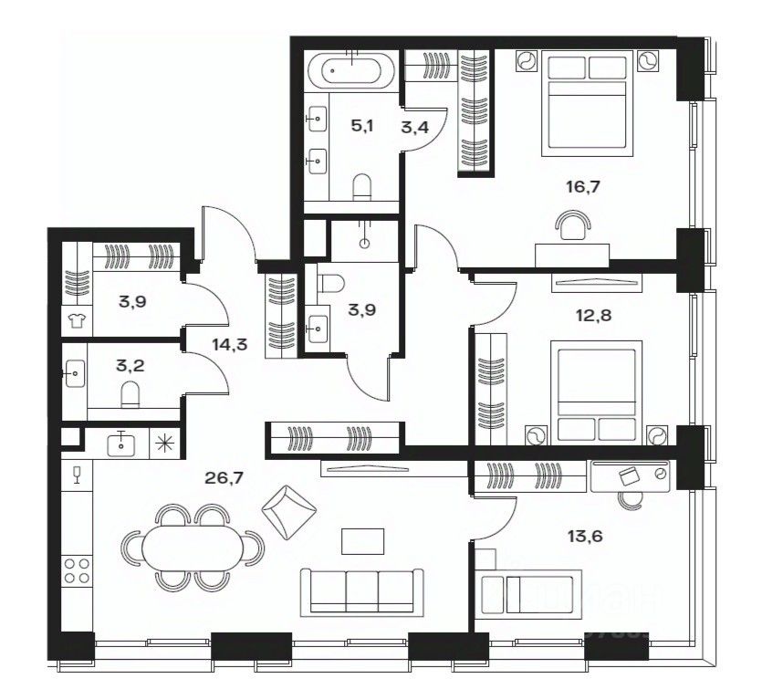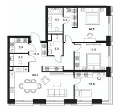 Квартира с максимально функциональной планировкой. Большая кухня-гостиная(26.7кв) с двумя панорамными окнами, три уютные комнаты, включая полноценный мастер блок с совмещенным санузлом, санузла всего три и гардеробная при входе(3.9кв). Идеально подходит для семейной жизни с детьми.