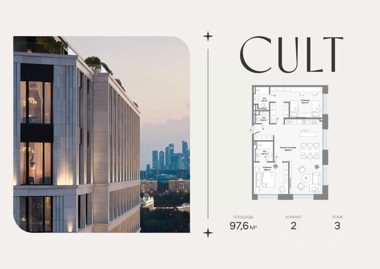 Продается 2-комнатная квартира площадью 97,6 кв.м. на 3-м этаже 9-этажного Клубного дома CULT. Высота потолков 3,2 м.
