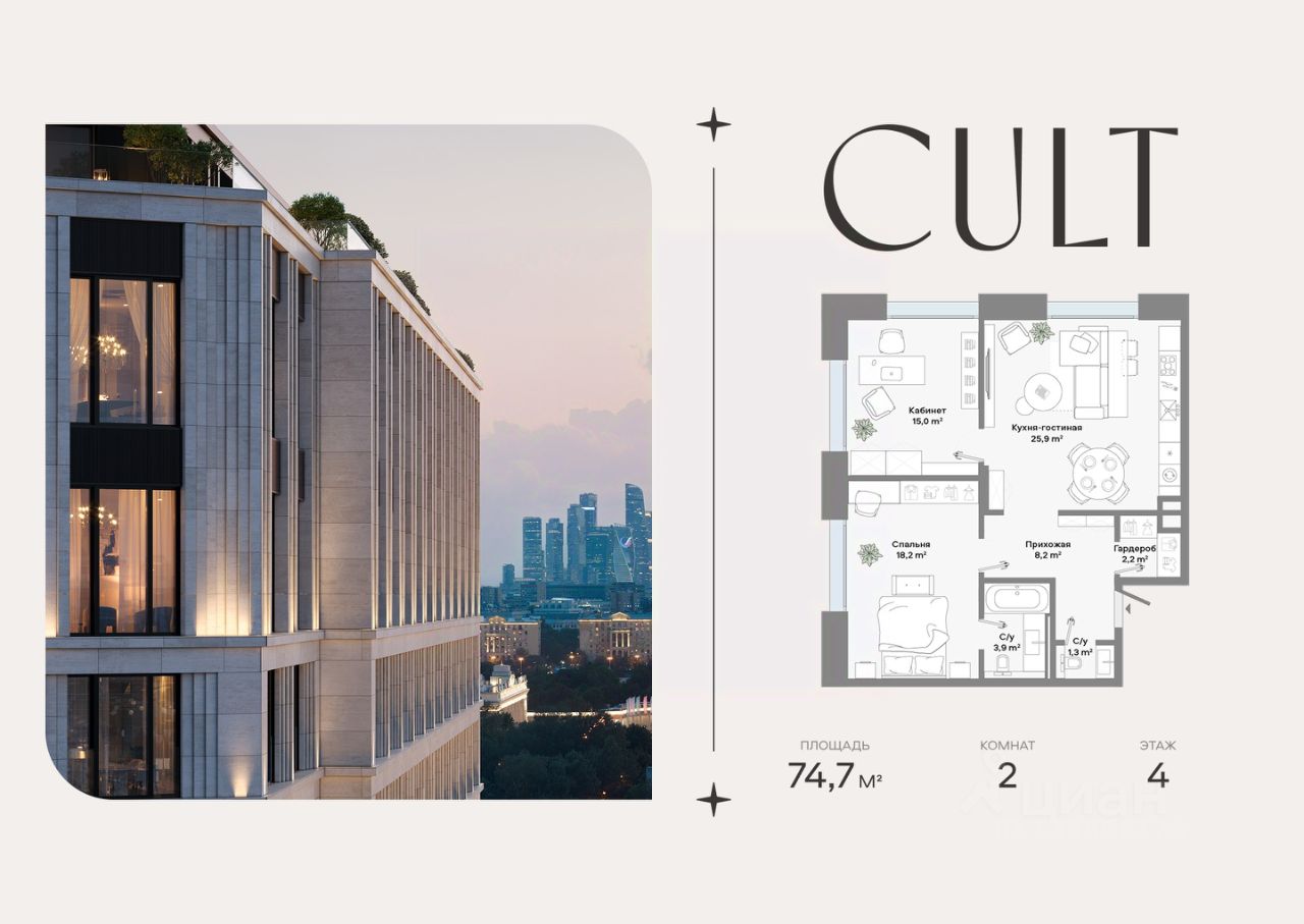 Продается 2-комнатная квартира площадью 74,7 кв.м. на 4-м этаже 9-этажного Клубного дома CULT. Высота потолков 3,2 м.