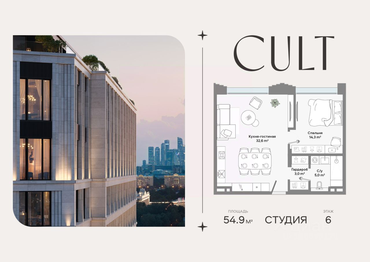 Продается Студия площадью 54,9 кв.м. на 6-м этаже 9-этажного Клубного дома CULT. Высота потолков 3,2 м.