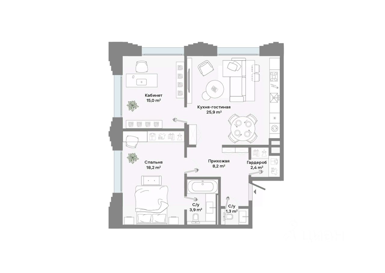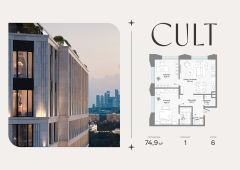 Продается 1-комнатная квартира площадью 74,9 кв.м. на 6-м этаже 9-этажного Клубного дома CULT. Высота потолков 3,2 м.