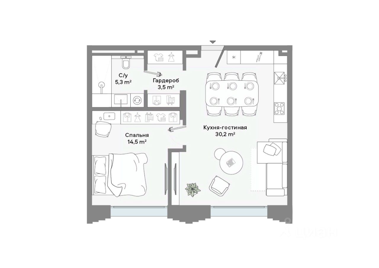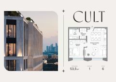 Продается 1-комнатная квартира площадью 53,5 кв.м. на 6-м этаже 9-этажного Клубного дома CULT. Высота потолков 3,2 м.