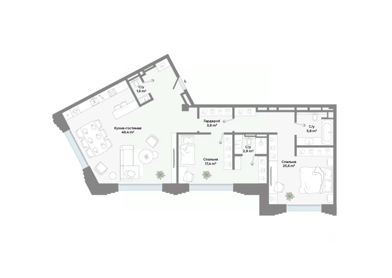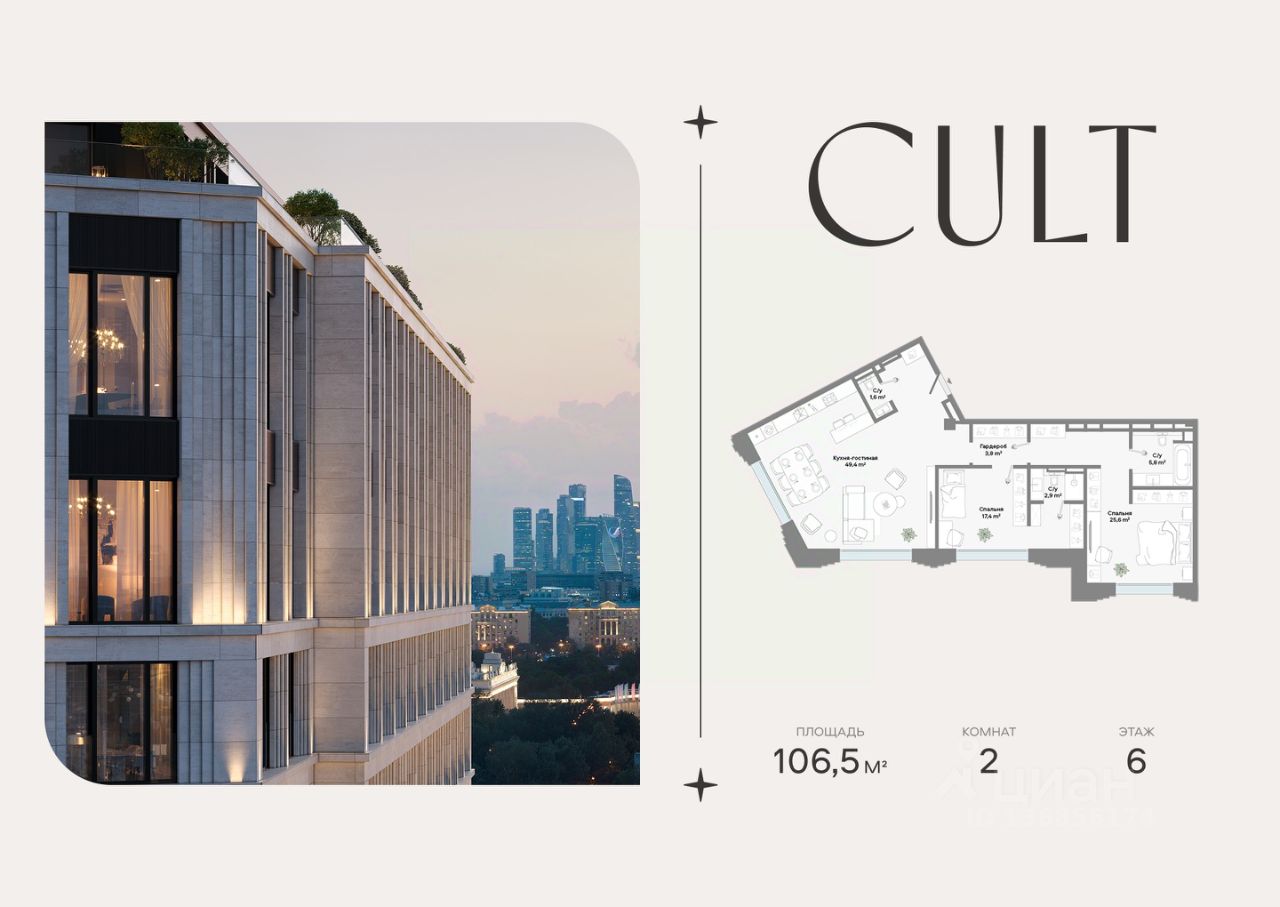 Продается 2-комнатная квартира площадью 106,5 кв.м. на 6-м этаже 9-этажного Клубного дома CULT. Высота потолков 3,2 м.