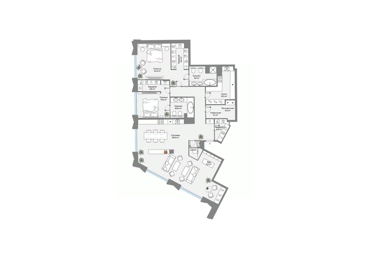 Продается 3-комнатная квартира площадью 173,3 кв.м. на 8-м этаже 9-этажного Клубного дома CULT. Высота потолков 4,5 м.