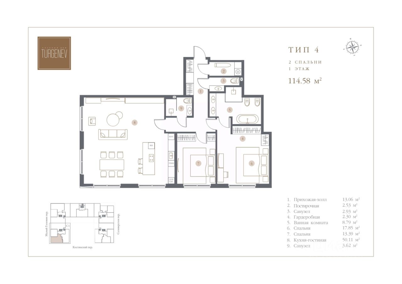 Квартира на 1 этаже Клубного дома TURGENEV: 2 спальни, премиальная финишная отделка, дом сдан. Просторная кухня-гостиная-столовая (50,11 м²) с панорамными окнами на юг и восток обеспечивает обилие естественного света. Спальни (17,85 м² и 13,39 м²) выходят на тихий Костянский переулок. Во всех спальнях и прихожей-холле предусмотрены места для хранения. Помимо ванной комнаты (8,79 м2) при мастер-спальне, в квартире есть санузел с душем, гостевой санузел, гардеробная и постирочная.