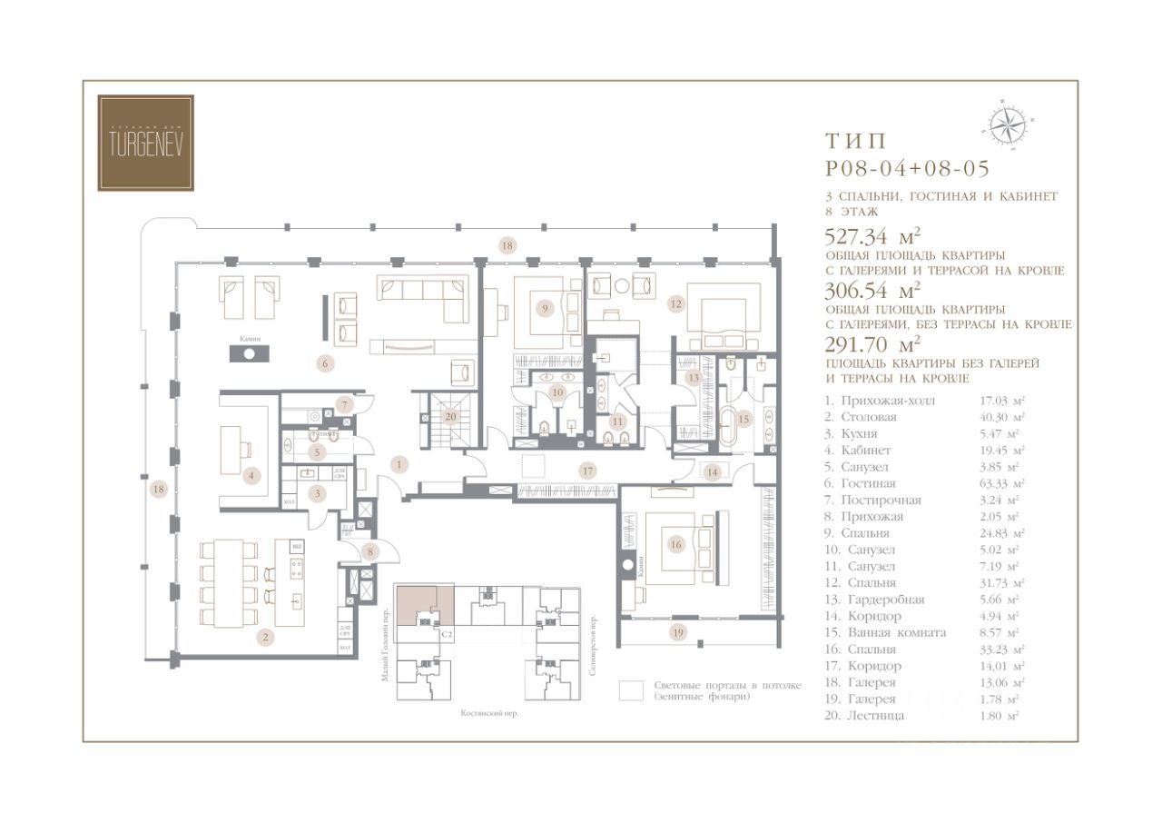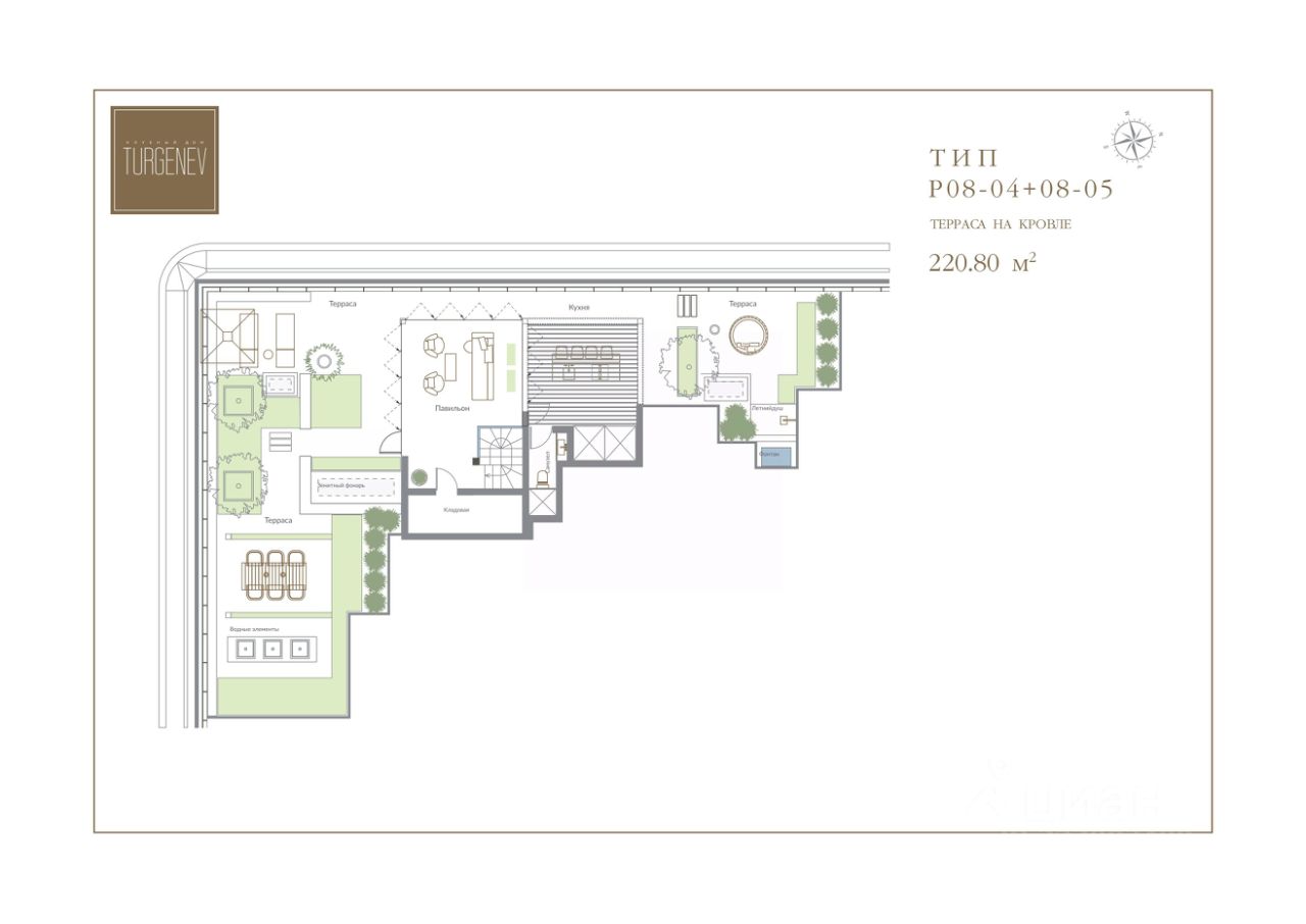 Самый просторный пентхаус в доме: площадь с учетом террасы - 527 м2, 3 спальни, 8 этаж Клубного дома TURGENEV.