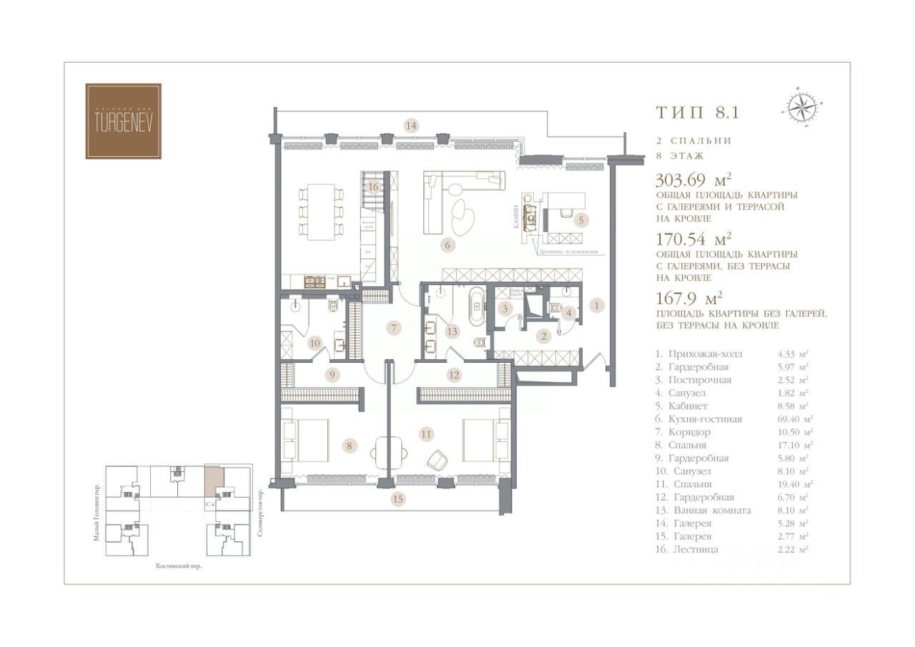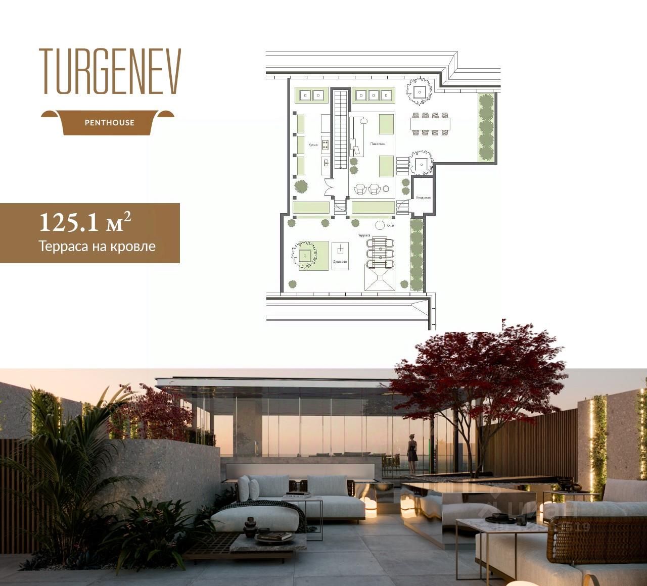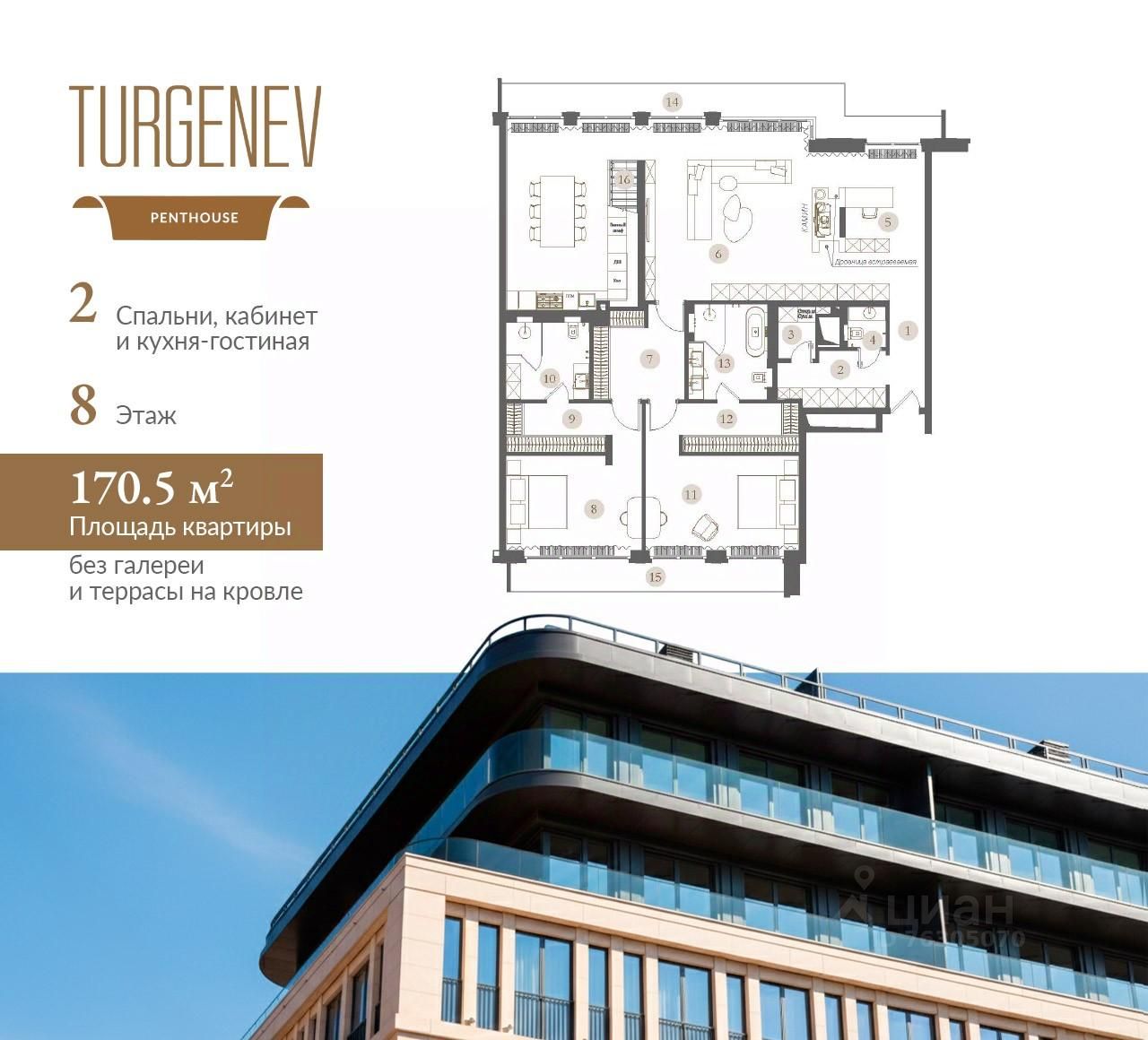Пентхаус с 2 спальнями (167,9 м2) и премиальной финишной отделкой располагается на 8 этаже Клубного дома TURGENEV и обладает выходом на собственную террасу на кровле (125,10 м2). Просторная кухня-столовая-гостиная (69,40 м2) с дровяным камином и кабинетом (8,58 м2) имеет выход на открытую галерею (5,28 м2). На галерее можно организовать зону для отдыха (столик, кресла), где приятно проводить время с чашечкой кофе и любоваться западной частью Москвы. Панорамные окна и еще одна открытая галерея мастер-спальни (19,40 м2) и второй спальни (17,10 м2) выходят на уютный внутренний двор-сад с фонтанами и водными каналами. При мастер-спальне располагается ванная комната с двумя раковинами (8,10 м2), при второй спальне душевая комната. В каждой спальне предусмотрена гардеробная (6,70 м2 и 5,80 м2). В пентхаусе также есть гостевой санузел (1,82 м2) и постирочная. Дом сдан.
