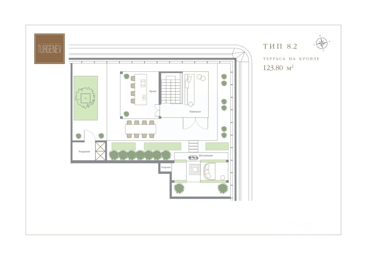 Пентхаус с 2 спальнями (134,4 м2) и премиальной финишной отделкой располагается на 8 этаже Клубного дома TURGENEV и обладает выходом на собственную террасу на кровле (123,80 м2). По всей длине внешнего периметра пентхауса - вдоль двух спален и просторной кухни-столовой-гостиной (58,03 м2) с дровяным камином и зоной кабинета, протянулась открытая галерея (7,50 м2) с видом на северо-западную часть Москвы. Панорамные окна мастер-спальни (16,70 м2) выходят на северную сторону - тихий Селиверстов переулок, а окна второй спальни (18,70 м2) на западную. При мастер-спальне располагается ванная комната с двумя раковинами (9,72 м2), при второй спальне - душевая комната (8,30 м2). У каждой спальни есть собственная гардеробная (5,02 м2 и 6,10 м2). В квартире также есть гостевой санузел (1,64 м2) и постирочная. Дом сдан. Клубный дом TURGENEV (Тургенев) расположен в ЦАО Москвы в районе Чистых прудов, в тихом месте на Костянском переулке между Садовым и Бульварным кольцом, в 3 км от Красной площади Кремля. Рядом большое количество достопримечательностей, музеев, театров, ресторанов, баров, торговых центров. Архитектурный проект дома разработан при участии международной команды архитекторов: Squire&Partners из Британии и Building Design Architectuur из Нидерландов. Фасад - натуральный камень: первые 6 этажей - португальский известняк, 7 и 8 этажи - гранит Dark Brown. Клубный дом TURGENEV имеет П-образную форму и состоит из 8 этажей, 5 секций и 118 квартир, включая двухуровневые пентхаусы с террасами и каминами. Все квартиры в Клубном доме TURGENEV реализуются с чистовой премиальной дизайнерской отделкой в современном стиле контемпорари от нидерландского бюро Wolterinck. В отделке квартир в TURGENEV используются экологичные, природные материалы премиального качества: пол из натуральной австрийской паркетной доски Austriawood, стены - итальянская краска PRATTA Exclusive, в санузлах - английская штукатурка Tadelakt и натуральный мрамор: итальянский Wooden White и греческий Pirgon. В каждой квартире установлены кухни от итальянского бренда Cesar со встроенной бытовой техникой премиальной линейки Smeg. Кухонный остров, столешница и фартук кухни выполнены из эксклюзивного итальянского мрамора Arabescato Grigio Orobico, одним из лучших видов мрамора на итальянском рынке натуральных отделочных камней. Внутренний двор с садом Клубного дома TURGENEV - оазис с зелеными газонами, мощеными тропинками, фонтанами, водными каналами и зонами для отдыха. Сад идеально вписан в пространство внутреннего двора. В доме предусмотрен инфраструктурный этаж, на котором расположены бассейн, фитнес-зона, зал для йоги, сауна, хаммам, дорожка Кнейпа, массажные кабинеты, кинотеатр, ресторан, винная, сигарная и переговорная комнаты. Вся инфраструктура Клубного дома TURGENEV также выдержана в едином стиле проекта. Каждый покупатель квартиры в Клубном доме TURGENEV может заказать дополнительную опцию - меблировка "под ключ". Лоты в новостройке можно оборудовать дизайнерской мебелью итальян