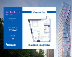 Продаётся 1-к квартира 37.8 кв.м. на 34-м этаже 51 этажного дома.