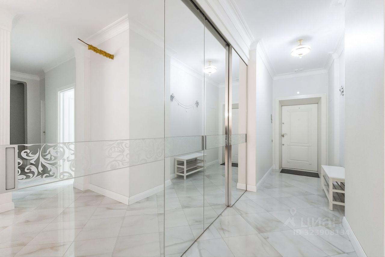 Планировка: просторная кухня-гостиная, 3 изолированные спальни, гардеробная, 2 совмещенных санузла (душевая + ванна с джакузи), на этаже имеется изолированный мусоропровод, комната хранения с выходом на общий балкон, два пассажирских и один грузовой лифт.