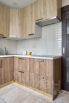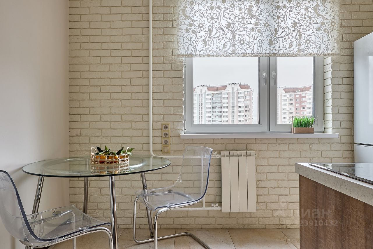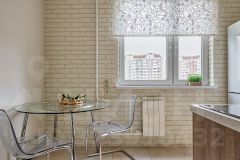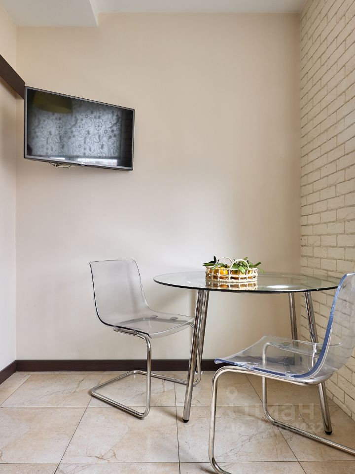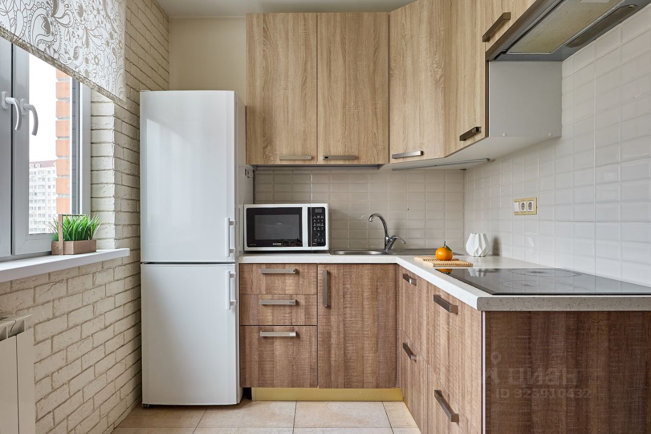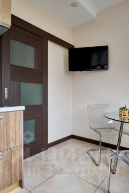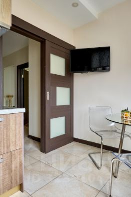 На кухне современный встроенный гарнитур, холодильник, телевизор, удобное расположение раздвижной двери-купе.