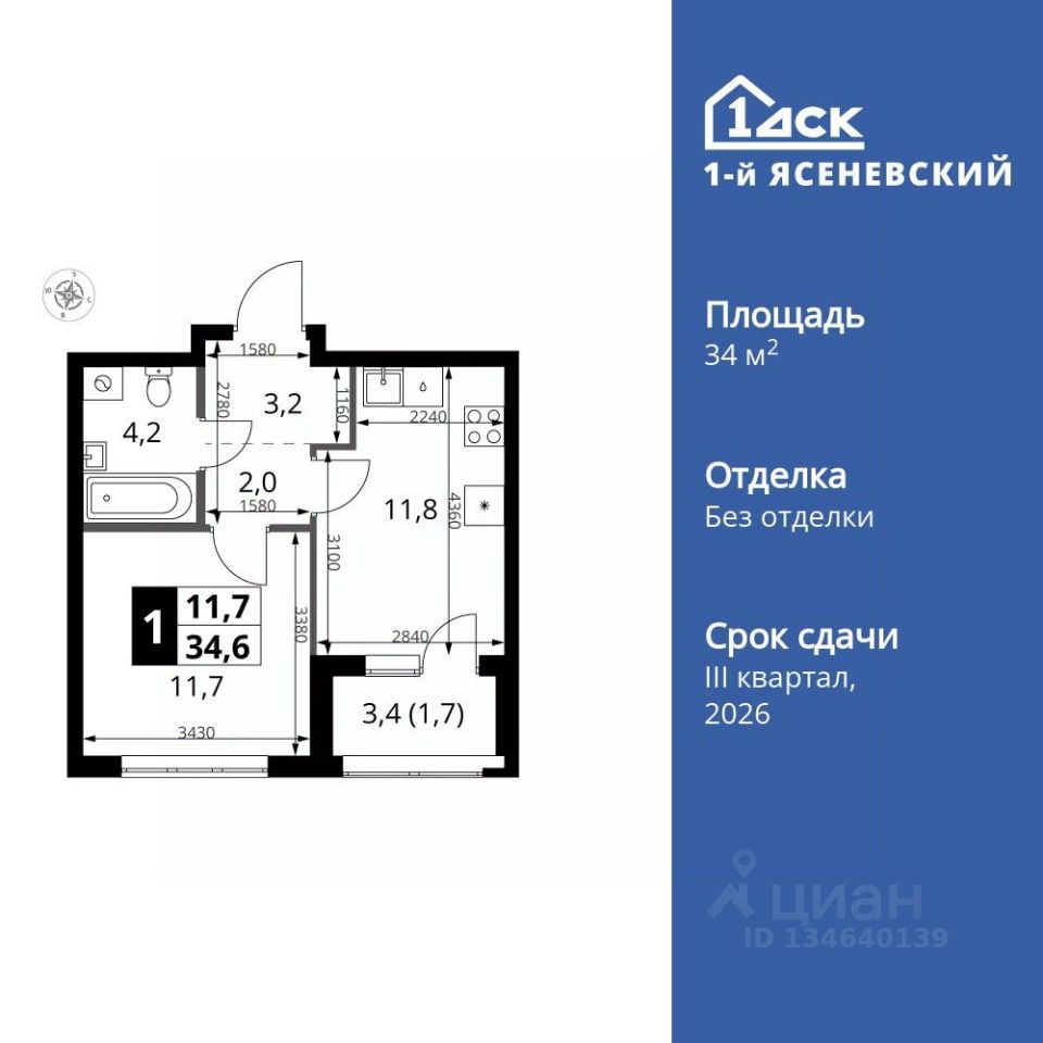 Продаётся 1-к квартира номер 286 общей площадью 34.6 кв.м. на 2-м этаже 18 этажного здания. Без отделки.