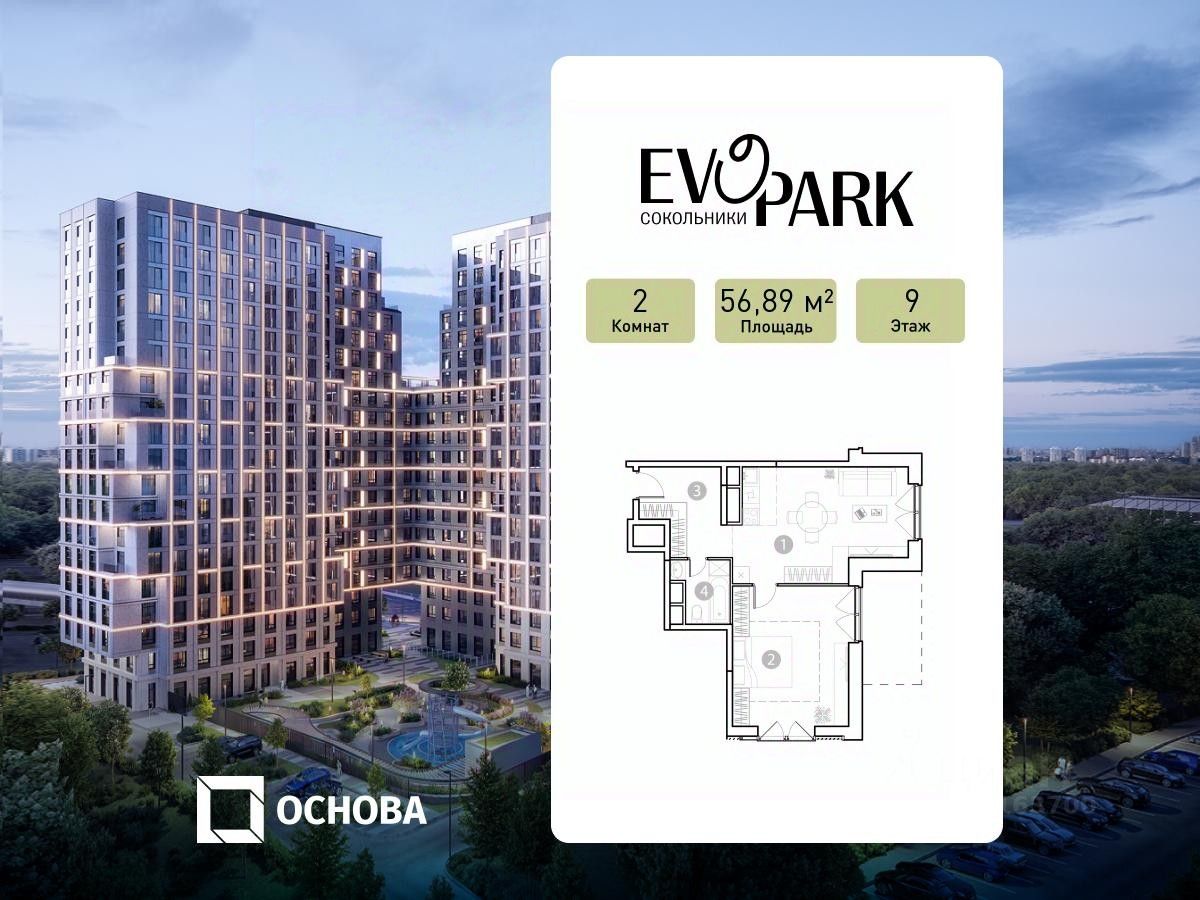 Продаются 2-к апартаменты площадью 56.89 кв.м. на 9-м этаже 20 этажного дома в EVOPARK Сокольники от ГК ОСНОВА.