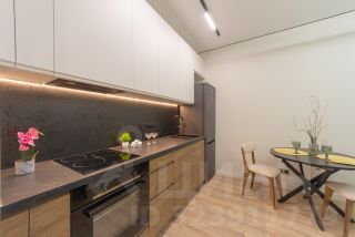 Укомплектована необходимой мебелью и техникой: холодильник, посудомоечная машина, плита, духовой шкаф, вытяжка, теплый пол.