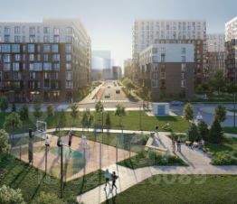 Жилой комплекс в окружении лесопарков и рядом с рекой. До станции МЦД-4 "Санино" можно дойти пешком за 7 минут, а на территории проекта появится транспортно-пересадочный узел с торговым центром. Для жителей построят школу, 2 детсада, в одном из которых будут развивающие кабинеты-трансформеры.