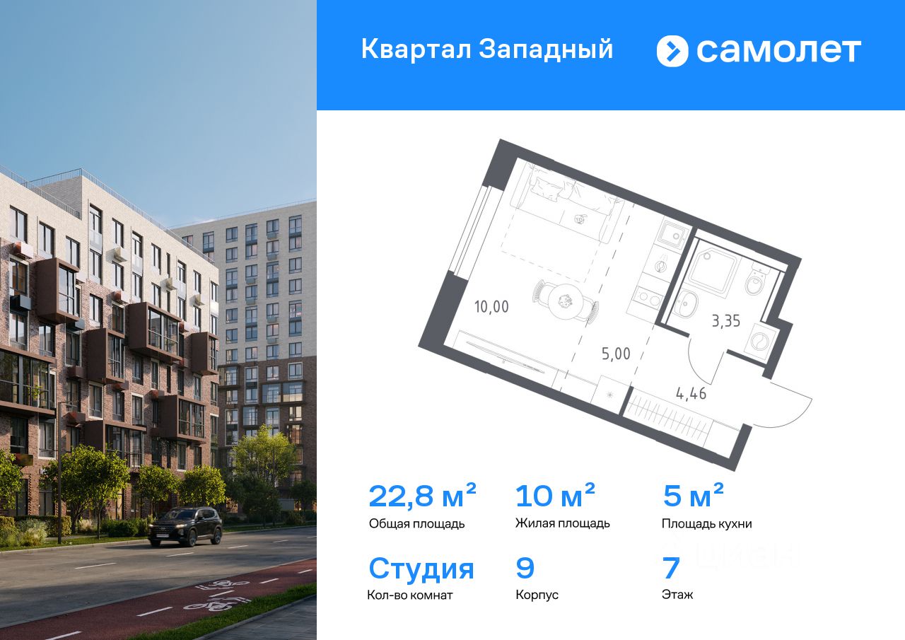Строим кварталы для жизни с заботой о будущем. Предлагается квартира студия комфорт-класса 22,81 кв.м в корпусе 9 на 7 этаже, в ЖК "Квартал Западный" Квартира с чистовой отделкой. Доступность дополнительных опций уточняйте у застройщика. Приобрести квартиру возможно по специальным акциям от застройщика, с текущими условиями акций можно ознакомиться в блоке "Акций". Цена динамическая и может отличаться, уточняйте актуальность у застройщика. Жилой комплекс в окружении лесопарков и рядом с рекой. До станции МЦД-4 "Санино" можно дойти пешком за 7 минут, а на территории проекта появится транспортно-пересадочный узел с торговым центром. Для жителей построят школу, 2 детсада, в одном из которых будут развивающие кабинеты-трансформеры. Дворы — тихое зеленое пространство без машин. В проекте появится собственный ландшафтный парк с благоустроенной набережной и центральная площадь, на которой будут проводиться различные мероприятия. Высота домов — от 5 до 15 этажей. Фасады выполняют в естественных оттенках, в соответствии с дизайн-кодом "Полевой луг". У каждой секции — свое цветовое решение. Белый цвет верхних этажей добавляет застройке легкости. Фасады облицованы клинкерным глазурованным кирпичом, который используют в проектах бизнес-класса.