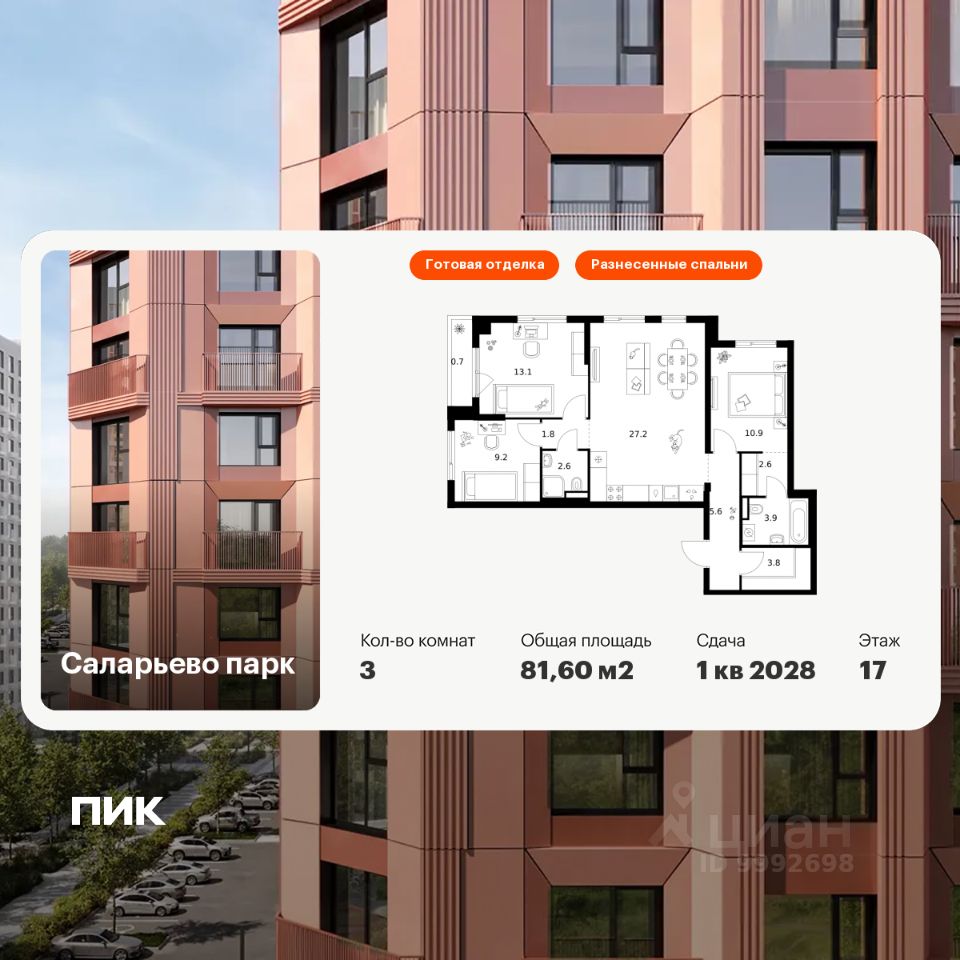 Продаётся 3-комн. квартира площадью 81,6 кв.м на 17 этаже 18 этажного дома (Корпус 74.1, Секция 1) проекта ПИК Саларьево парк. Светлый просторный подъезд на уровне земли, функциональная планировка, большие окна, c отделкой.