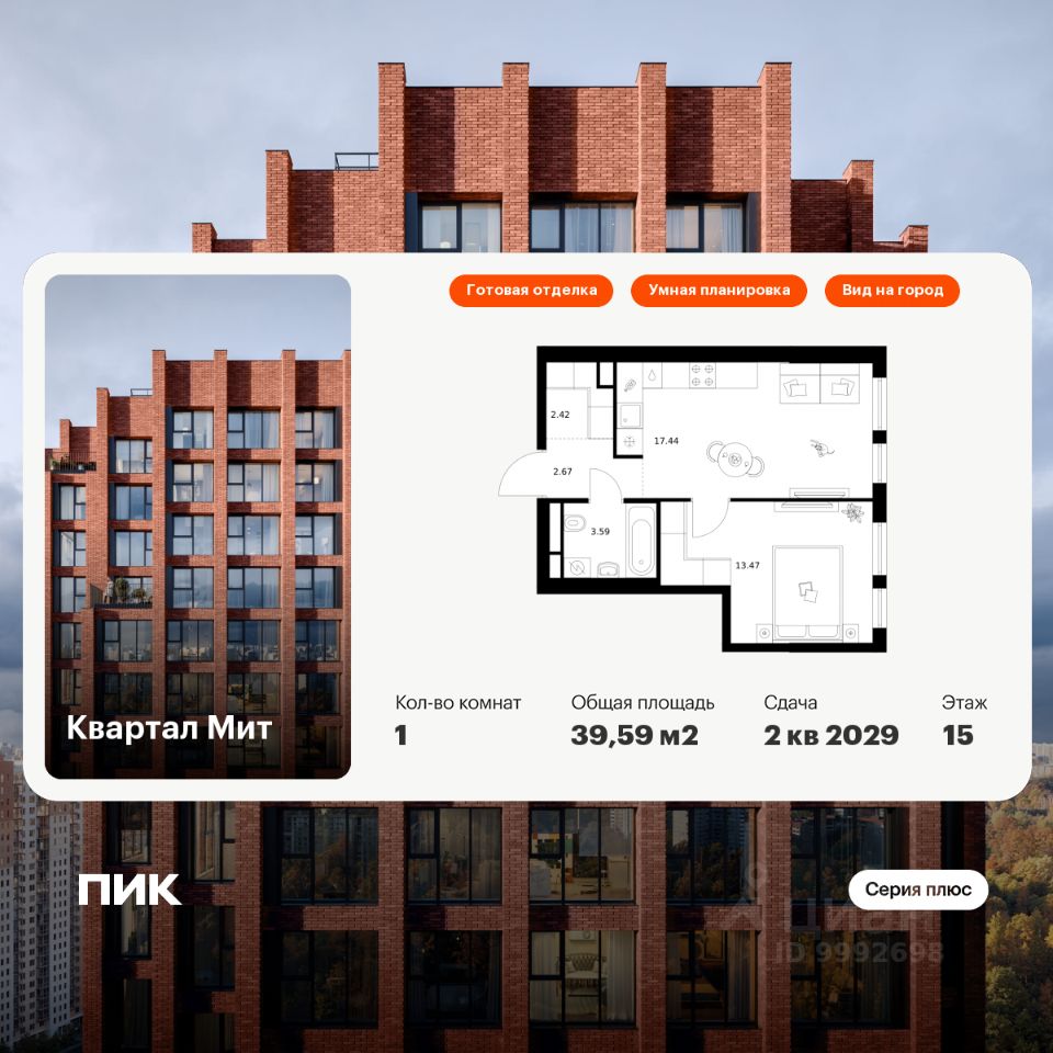 Новостройка! Продается 1-комн. кв-ра площадью 39,59 кв.м, (Корпус 3.4, Секция 4) 15 этаж 32-этажного дома в Квартал Мит от ПИК. "Квартал Мит" строится в экологически чистом районе Митино, где по соседству расположен большой лесопарк, а с двух сторон протекают реки Сходня и Журавка. Для семей с детьми здесь появится школа и два детских сада.