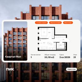 Новостройка! Продается 1-комн. кв-ра площадью 33,1 кв.м, (Корпус 3.4, Секция 4) 21 этаж 32-этажного дома в Квартал Мит от ПИК. "Квартал Мит" строится в экологически чистом районе Митино, где по соседству расположен большой лесопарк, а с двух сторон протекают реки Сходня и Журавка. Для семей с детьми здесь появится школа и два детских сада.