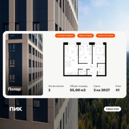 Продаётся 2-комн. квартира площадью 55,9 кв.м на 41 этаже 45 этажного дома (Корпус 1.4, Секция 1) проекта ПИК Полар. Светлый просторный подъезд на уровне земли, функциональная планировка, большие окна, c отделкой.