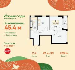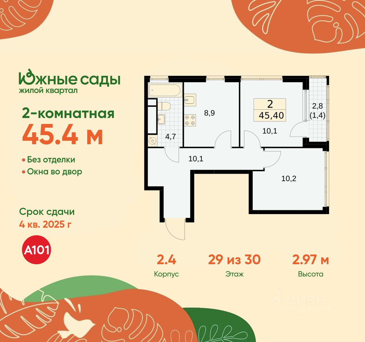 Продается двухкомнатная квартира 1179 в новостройке ЖК "Южные Сады" по адресу Москва, ЮЗАО, Южное Бутово, Жилой комплекс "Южные Сады", корп.2.4. Общая площадь квартиры - 45.40 кв. м., этаж 29 из 30, секция 9. Тип проекта, по которому построен дом - монолит, компания-застройщик - ООО "А101". Стоимость квартиры - 18218566 Р. Срок сдачи - 4 квартал 2025.