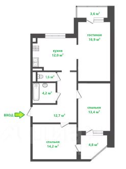 Общая площадь квартиры - 78,4 кв. м, площадь без лоджий (ЕГРН) - 74,7 кв.м., гостиная - 16,9 кв. м, кухня - 12,0 кв. м, две спальни - 13,4 и 14,2 кв.м., две лоджии 3,6 и 4,8 кв.м. (застеклены), раздельный санузел, просторный коридор.