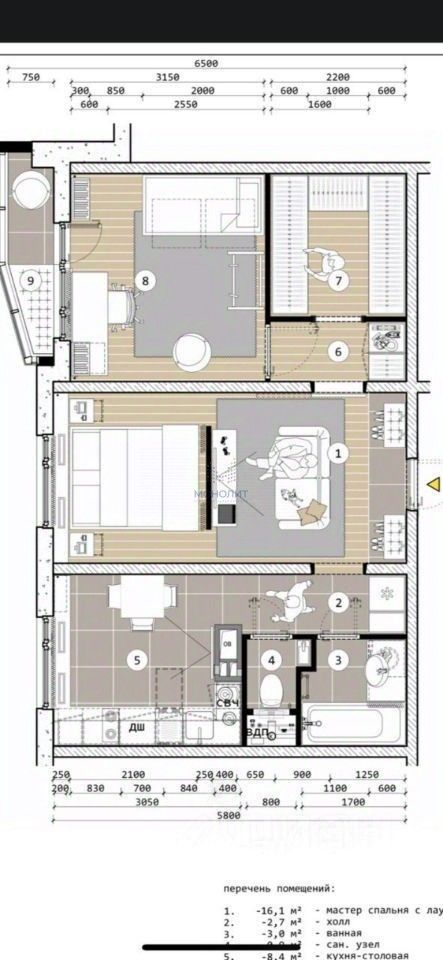Уютная МАСТЕР-СПАЛЬНЯ с местом для сна и ГАРДЕРОБНОЙ;