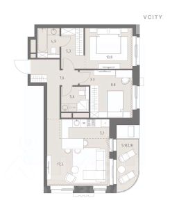 Площадь квартиры 71,6 м2 включает в себя: кухню-гостиную с выходом на просторную лоджию, площадью 5,9 кв м, мастер-спальню с гардеробной и своим санузлом, детскую комнату или кабинет и гостевой с/у.