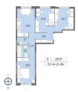 О КВАРТИРЕ: Вашему вниманию предлагается 3-комнатная квартира общей площадью 60.9 кв. метров на 11 этаже.