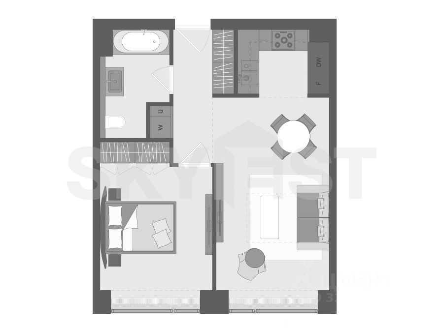 Планировка: кухня-гостиная, спальня, ванная, гостевой санузел.