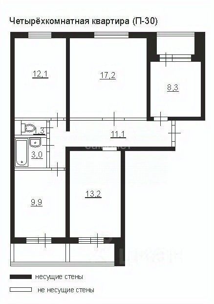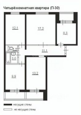 - Четыре изолированные комнаты: 17,2 / 12,1 / 13,2 / 9,9 м²