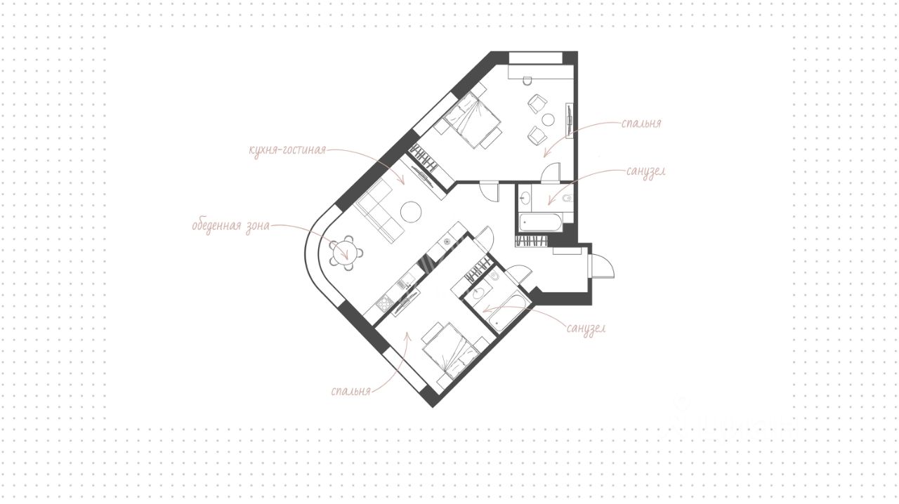 Угловая квартира с 2 спальнями площадью 80 м² в комплексе бизнес-класса Shagal. Квартира без отделки расположена на 9 этаже в корпусе 2, секция 2. Возможно спланировать кухню-гостиную с полукруглым окном, мастер-спальню с санузлом и гардеробной, детскую спальню или кабинет, гостевой санузел и холл. Панорамные окна ориентированы на 3 стороны, открываются виды во двор и на улицу. Дополнительно можно приобрести семейное машино-место.