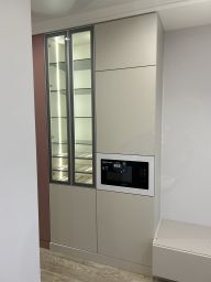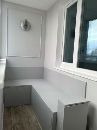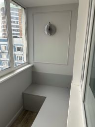 Балкон превращён в функциональное пространство: здесь удобная система хранения и комфортное место для утреннего кофе или вечернего отдыха.