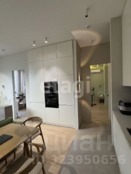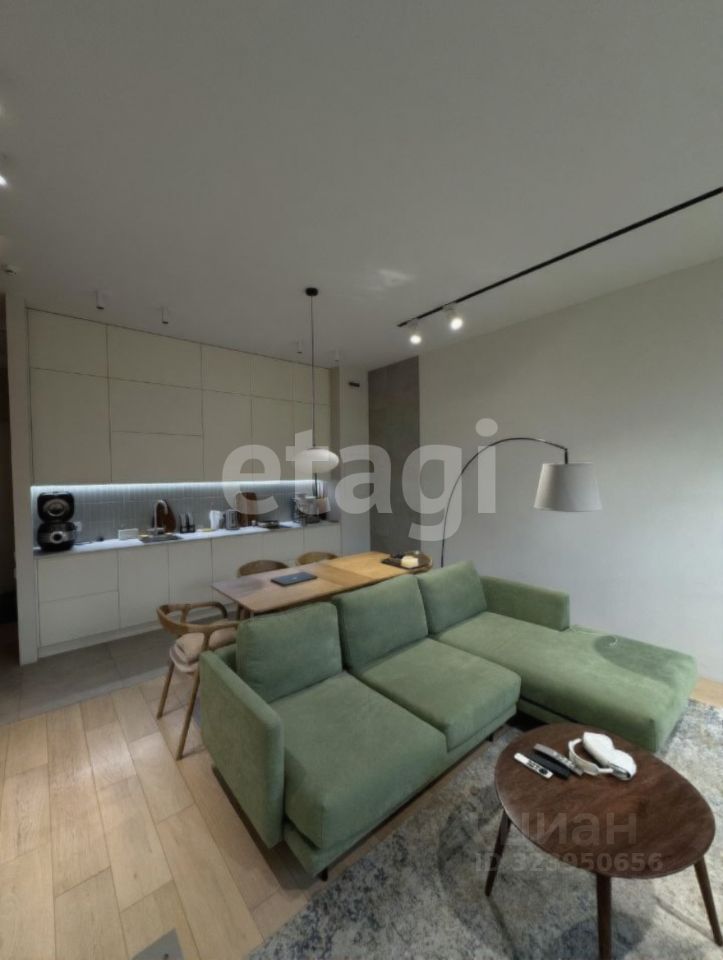 • Просторная кухня-гостиная с лаконичным встроенным гарнитуром и встроенной техникой.