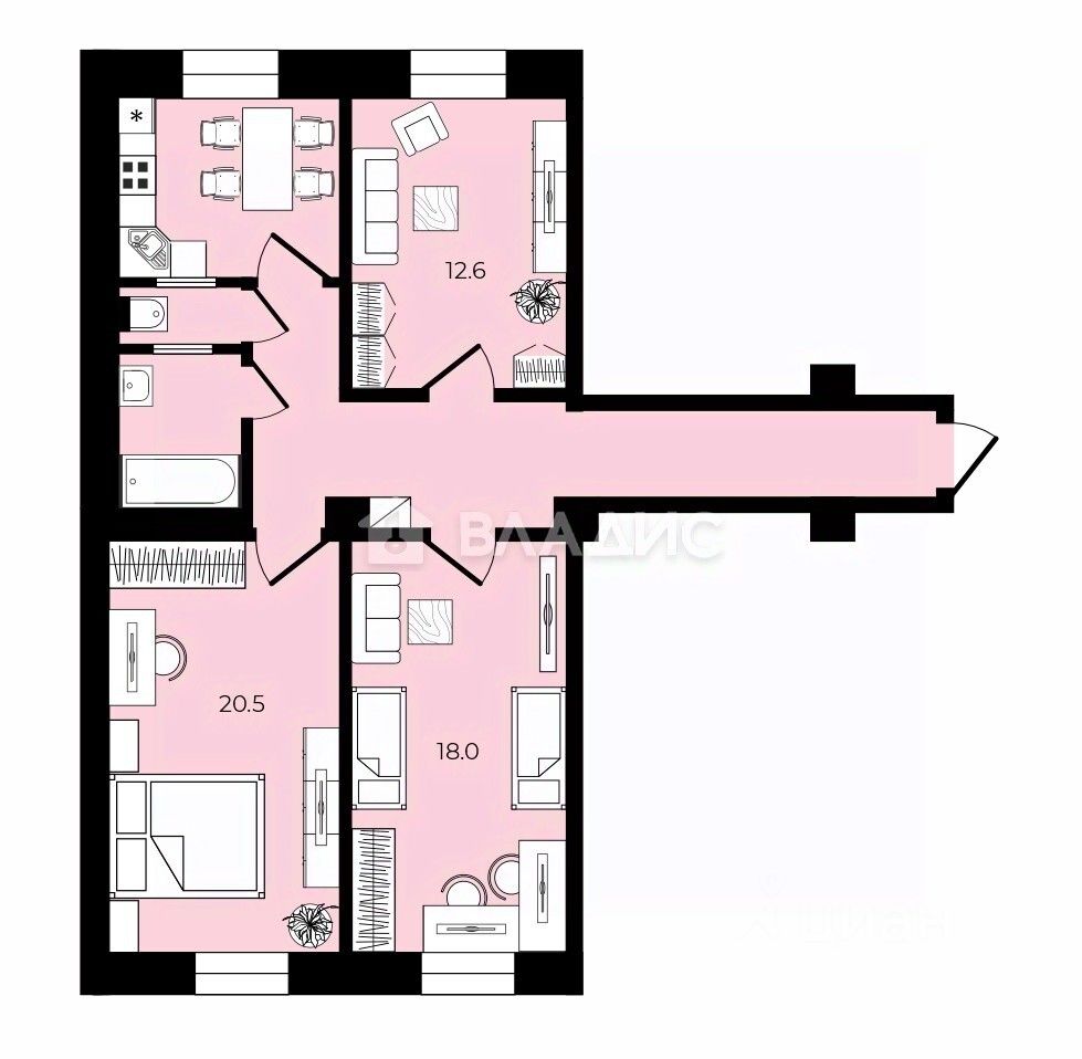 + Просторная квартира распашного типа, с окнами на две стороны на Север и Юг.