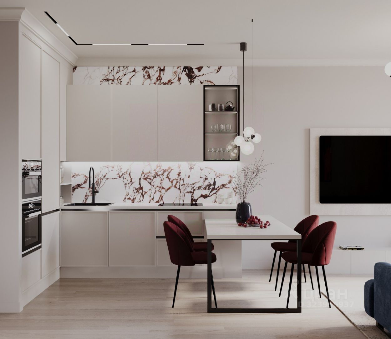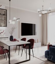 Большая кухня-гостиная 24м2, три изолированных комнаты. Две гардеробные, два санузла, в том числе в мастер-спальне.