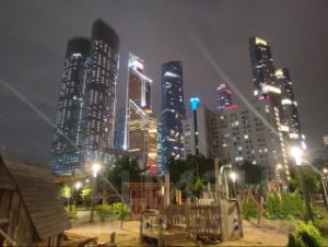 С Красногвардейских прудов вечером открывается сказочный вид на CITY PARK с "эмоциональной" архитектурной подсветкой