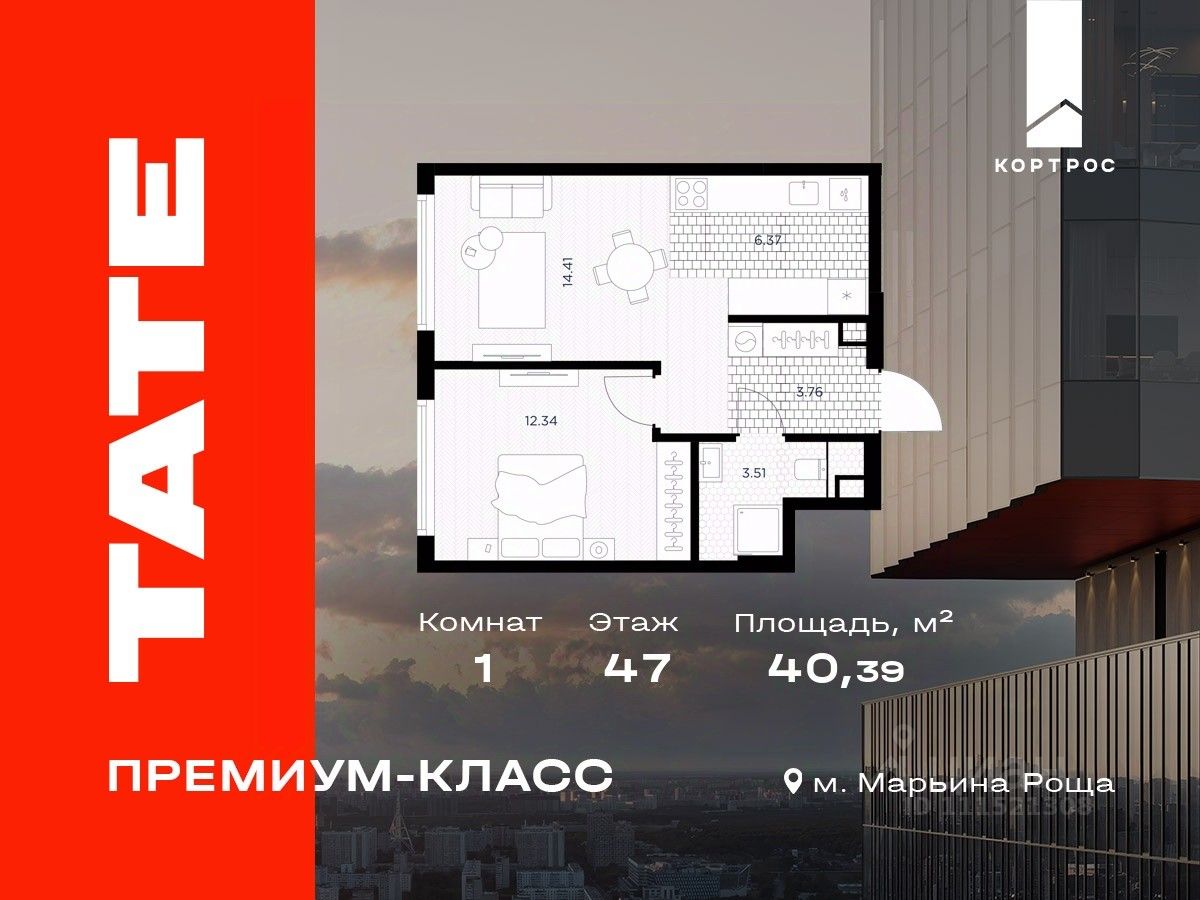 Продается 1-комнатная квартира от застройщика в ЖК премиум-класса TATE на 47 этаже. Общая площадь 40,39 м². Отделка предчистовая (white box). 1 санузел. Вид из окна на Тимирязевский парк. Башня A.