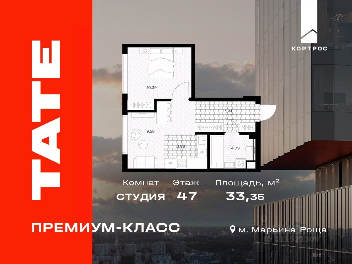 Продается 1-комнатная квартира от застройщика в ЖК премиум-класса TATE на 47 этаже. Общая площадь 33,35 м². Отделка предчистовая (white box). 1 санузел. Вид из окна на Тимирязевский парк. Башня A.