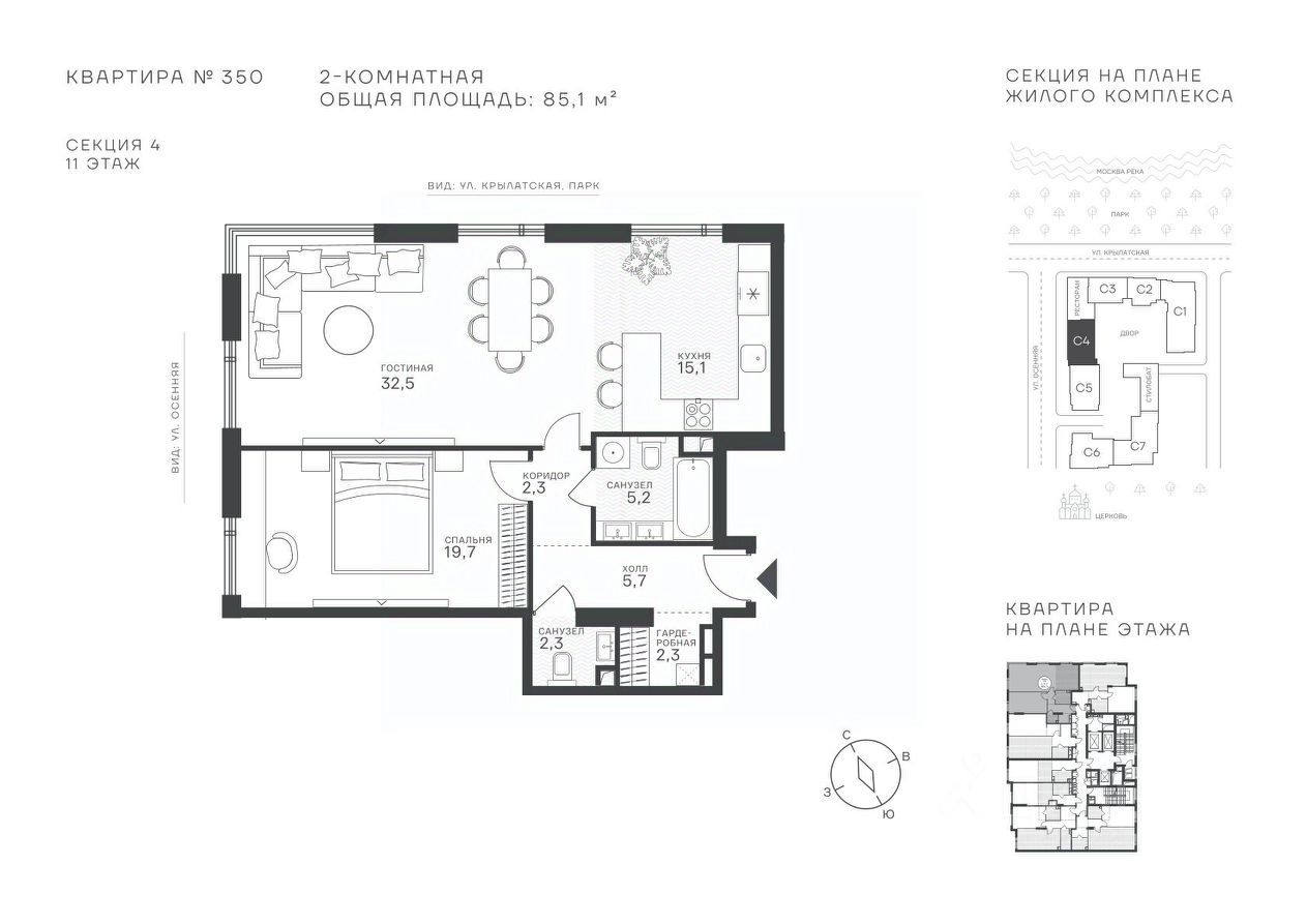 Успейте стать частью уникального проекта премиум-класса на западе Москвы! В продаже квартиры: 1-комнатные от 28,1 м²; 2-комнатные от 61,2 м²; 3-комнатные от 86,6 м²; 4-комнатные от 110,7 м². Первый взнос от 30%! Рассрочка на 2 года без переплат! Крылатское 33 это премиальный жилой комплекс от специализированного застройщика ООО "Сияние". Самый высокий небоскрёб в районе, достигающий отметки в 150 метров и малоэтажный клубный формат высотой от 42 метров на приватной территории площадью 1,4 га. Великолепные виды на излучину Москва-реки, Живописный мост и урбанистический облик города. Эксклюзивные форматы квартир с панорамным остеклением и патио-террасами. Двухуровневый паркинг на 271м/м, премиальные входные группы, ресторан высокой кухни, детский сад и эко-маркет на территории комплекса. Эксклюзивные преимущества: доступ к wellness-центру, коворкингу и клубной гостиной только для резидентов. Над проектом работали именитые российские архитектурные бюро: архитектор проекта бюро "Остоженка", планировочные решения от бюро Александры Федоровой. Расположение Пешком: 5-7 минут - до парка Звезд, Крылатского парка и набережной Москвы-реки; 15 минут - до метро Крылатское Арбатско-Покровской линии; 15 минут - до пристани Крылатская. На автомобиле: 10 минут - до Третьего транспортного кольца; 15 минут - до Садового кольца и Москва- Сити; 20-30 минут - до Аэропорта Внуково; 30-40 минут - до Аэропорта Шереметьево. В 300 метрах от комплекса - удобная транспортная развязка с проспектом Маршала Жукова, обеспечивающая легкий доступ к ключевым магистралям. Благоустройство: Просторная общественная гостиная; Коворкинг с кофе-баром, комфортные переговорные зоны с быстрым wi-fi, зарядными устройствами и библиотекой; Пространство friends lab для организации клубных мероприятий; Wellness-центр с фитнес-залом и массажными кабинетами; Ресторан высокой кухни; Частный детский сад; Детское кафе; Современный детский playhub; Спортивные площадки; Гипоаллергенный сад, безопасные водные пространства, декоративные пруды и сухие фонтаны; Высокоскоростные бесшумные лифты; Разделение зон для резидентов квартала и сервисного обслуживания. Окружение: - парки: Крылатские холмы, природно-исторический парк Москворецкий, Серебряный Бор; - учебные заведения: 5 образовательных комплексов, в которые входят 15 детских садов и 12 школьных корпусов. В удобной транспортной доступности гимназия им. Е. М. Примакова и международный лицей The International School of Moscow; - уникальные спортивные сооружения: гребной канал "Крылатское", легендарный велотрек "Крылатское", "Лата Трэк" для горнолыжников и сноубордистов, ледовый дворец "Крылатское"; - единственный в Москве парк развлечений под открытым небом, включающий более 70 вариантов досуга для любого возраста и времени года. Срок сдачи проекта: 2 квартал 2027 года. Финансирование и эскроу-счет обеспечены банком МКБ.