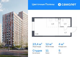 Строим кварталы для жизни с заботой о будущем. Предлагается квартира студия комфорт-класса 23,36 кв.м в корпусе 11 на 5 этаже, в ЖК "Цветочные Поляны"