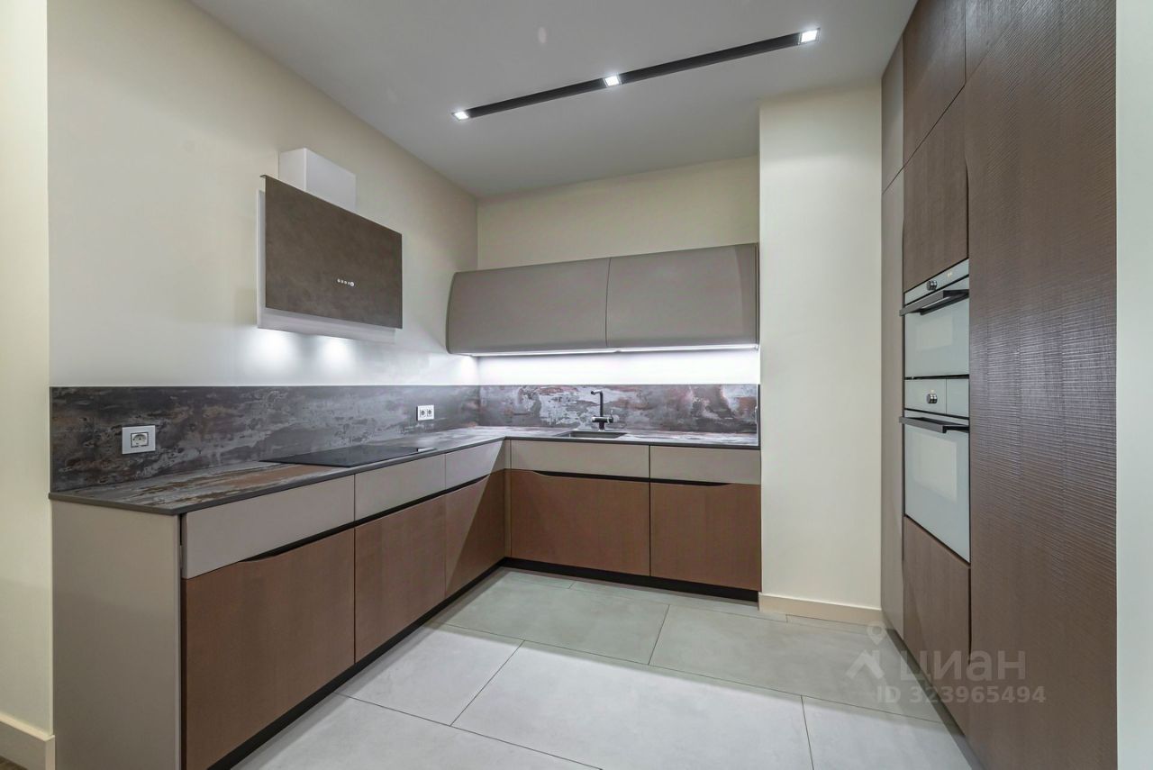 - Просторная кухня-гостиная с потрясающим видом на ЖК, оборудована стильной и современной TV панелью Presotto с полками для книг, электрическим камином и диваном премиального производителя Baxter