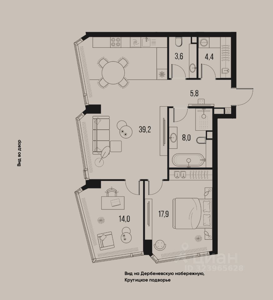 High Life / 94,4 м² / 15 этаж / бетон / 3 комнаты / вид во двор и на набережную