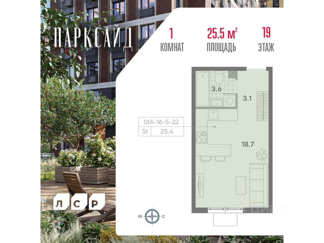 Продаётся квартира-студия общей площадью 25.5 кв. метров на 19 этаже жилого квартала Парксайд. Возводится в районе Чертаново Центральное Южного административного округа Москвы. В 2 км от будущего комплекса находится станция метро "Пражская". Для автомобилистов есть удобные выезды на Варшавское шоссе и Чертановскую улицу.