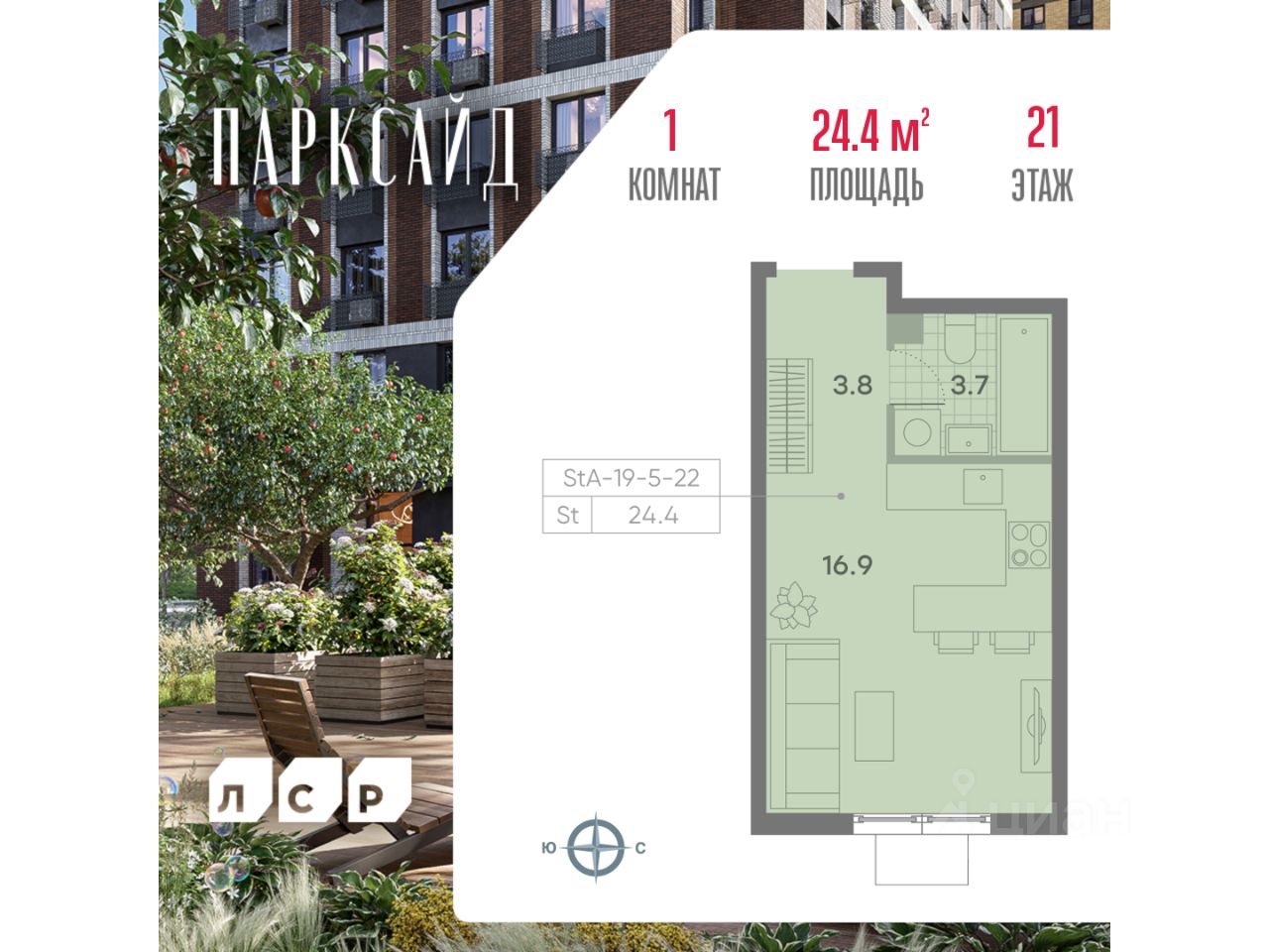 Продаётся квартира-студия общей площадью 24.4 кв. метров на 21 этаже жилого квартала Парксайд. Возводится в районе Чертаново Центральное Южного административного округа Москвы. В 2 км от будущего комплекса находится станция метро "Пражская". Для автомобилистов есть удобные выезды на Варшавское шоссе и Чертановскую улицу.
