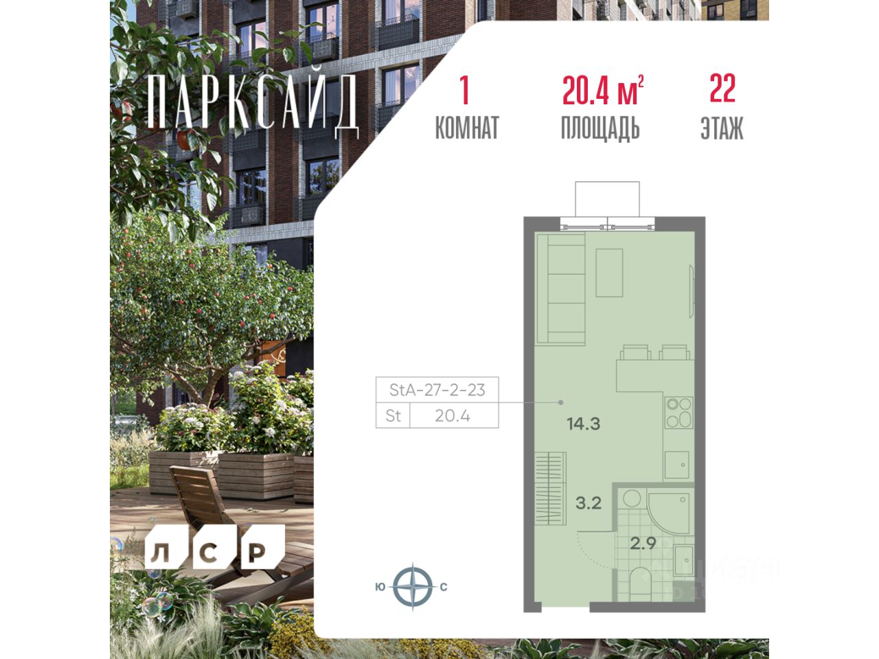 Продаётся квартира-студия общей площадью 20.4 кв. метров на 22 этаже жилого квартала Парксайд. Возводится в районе Чертаново Центральное Южного административного округа Москвы. В 2 км от будущего комплекса находится станция метро "Пражская". Для автомобилистов есть удобные выезды на Варшавское шоссе и Чертановскую улицу.
