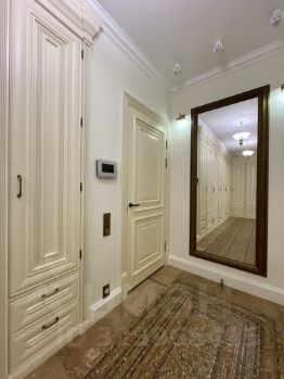 В ремонте применены оригинальные, но сдержанные дизайнерские решения неоклассический стиль, выдержанная палитра цвета слоновой кости, мозаичный пол, кованные двери с обожжёнными витражами, ретро-выключатели и чугунная ванная. В отделке использованы натуральные и современные экологичные материалы. Смонтированная система приточно-вытяжной вентиляции обеспечивает сбалансированный воздухообмен и кондиционирование. Кухонный гарнитур укомплектован премиальной немецкой бытовой техникой. В холле организованы места для хранения, постирочная оборудована всем необходимым.