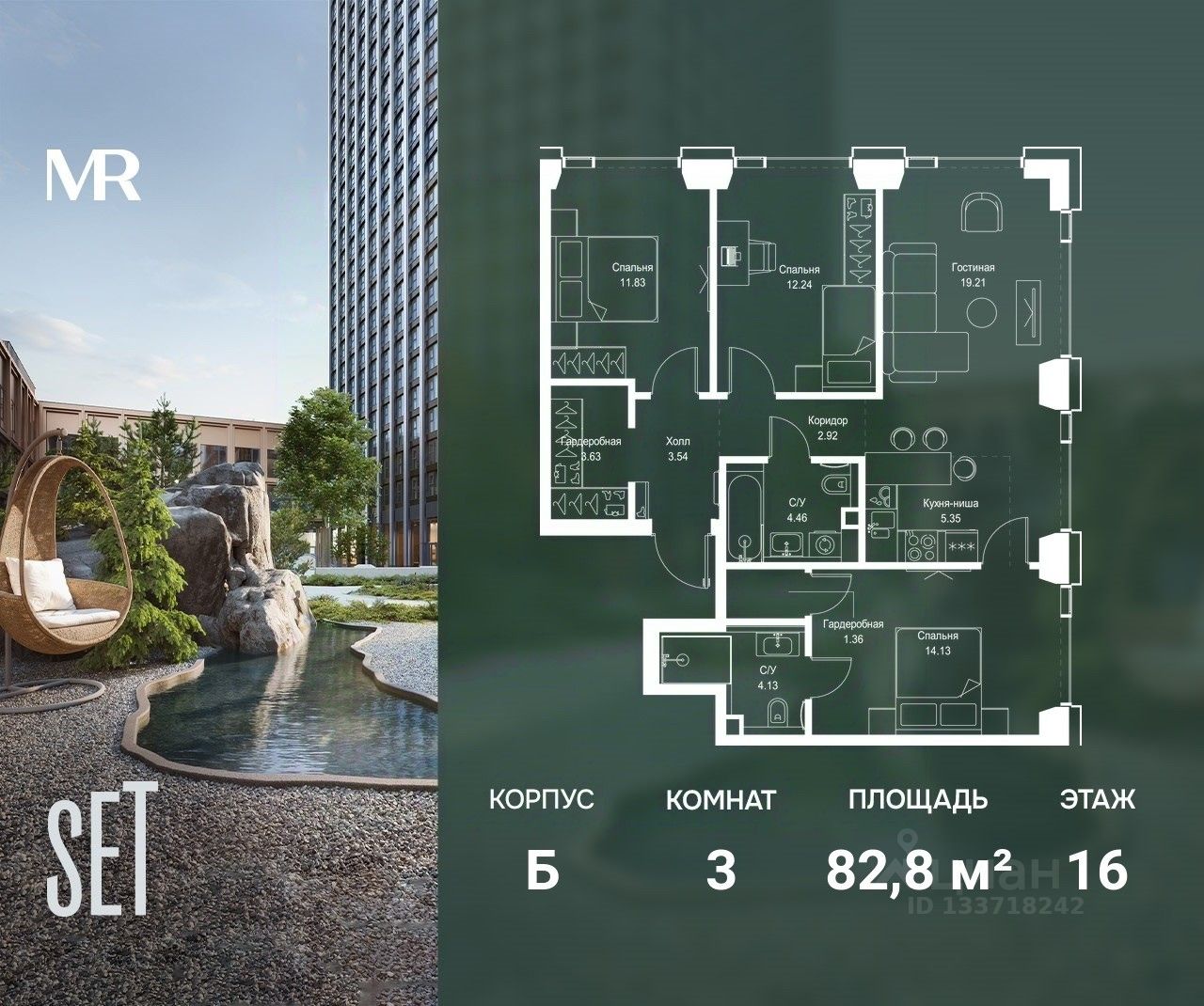 В ЖК SET продается 3-комнатная квартира площадью 82.80 м², расположенная в корпусе Б, на 16 этаже 59 этажного дома.