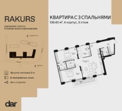 Продаётся 3-комнатная квартира 108.40 м² в жилом комплексе Ракурс. Квартиру отличают панорамное остекление, потолки [ceiling_height] м, улучшенная шумо и воздухоизоляция. Дом сдаётся в 1 квартале 2028 года, продажи проходят через эскроусчета. Подземный паркинг, коворкинг, закрытая благоустроенная территория с фонтаном и артобъектами. Гибкие условия покупки.